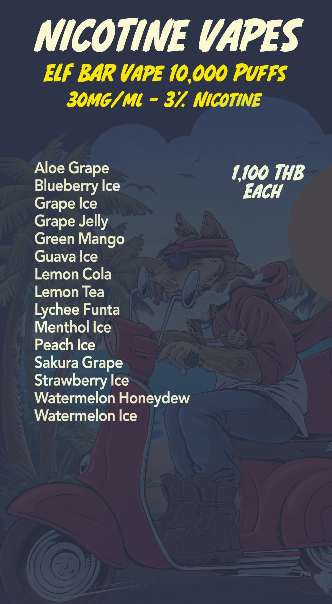 Nicotine Vapes Menu Browse our latest nicotine vapes below. Just send us your flavour choice, quantity, hotel/villa name, and preferred time. Tap Here to Order on WhatsApp Delivery starts from 2pm–3am. Minimum order and delivery fee depend on your location. Tap Here to Order on WhatsApp