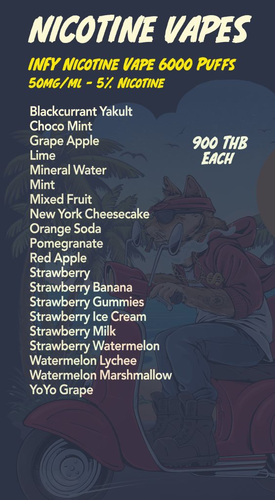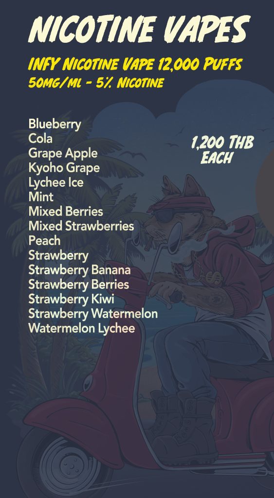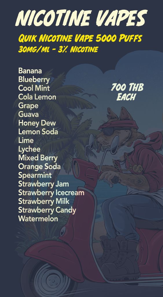 Are you searching for a reliable vape delivery service in Phuket? You have arrived at the right place. We have the largest selection of authentic nicotine and THC vapes in Phuket. We deliver everyday all over Phuket 1:30pm – 3am.